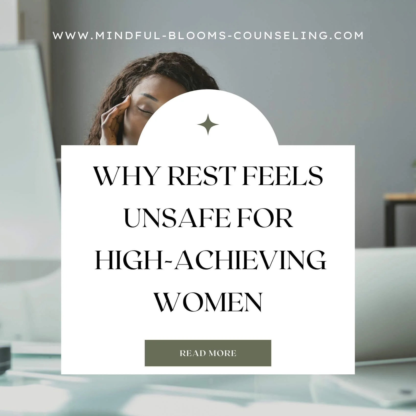 At my practice, Mindful Blooms Counseling, I help high-achieving women break free from the cycle of burnout, overworking, and guilt around rest. Therapy can help you understand the deeper patterns driving constant productivity while building healthier boundaries, self-worth, and emotional balance. If rest has always felt difficult, you don’t have to figure it out by yourself, and there is still hope. It’s possible to be ambitious and well-rested at the same time.